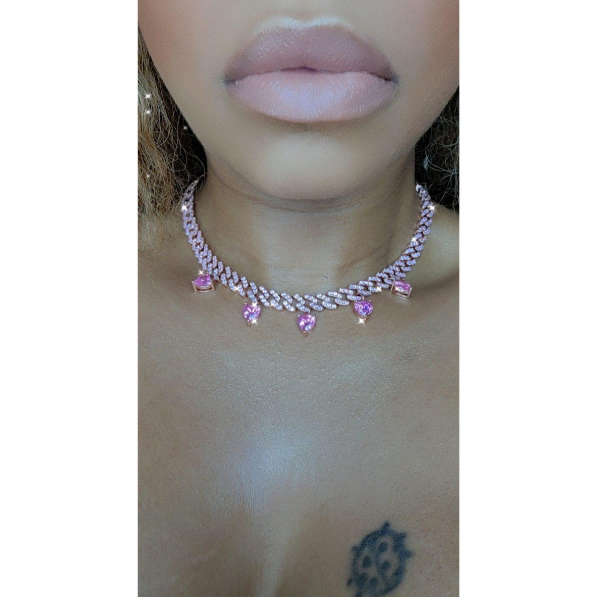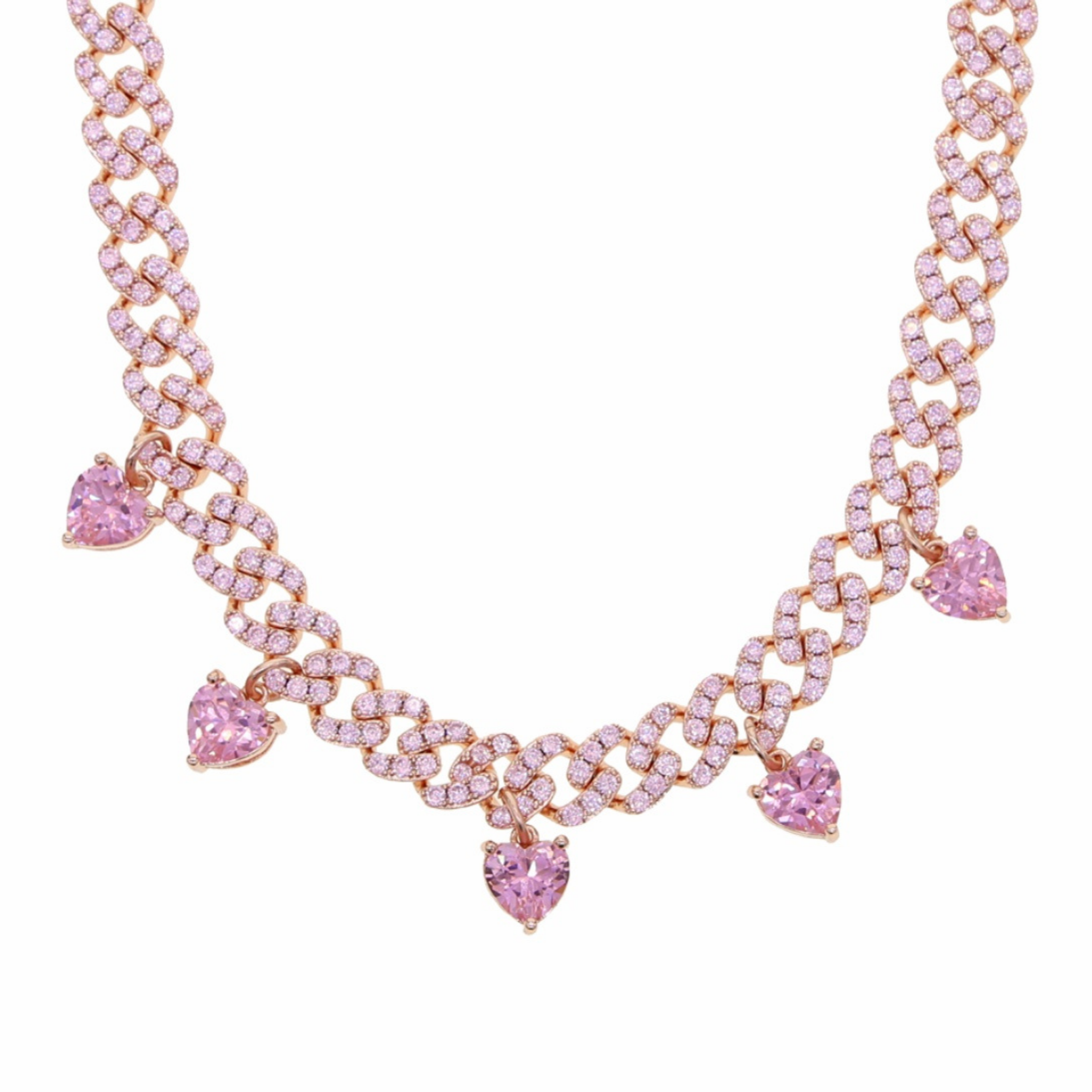 She is a Pink and Rose Gold CZ Paved Cuban Link Heart Necklace. She has adjustable link to fit all. She have 5 diamond hearts to complement your neckline. She Fits Lovely and give you a sexy Look To Your neck. You Can Add Her With additional small thin necklace that we have Available or your own to make your own unique new style.
