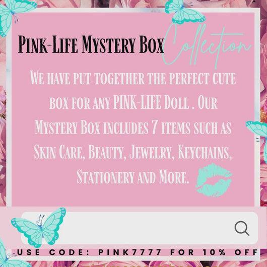 We have put together the perfect cute box for any PINK-LIFE Doll . Our Mystery Box includes over 10 items such as Skin Care, Beauty, Jewelry, Keychains, Stationery and More💋.